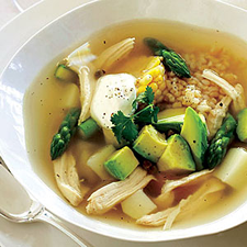 4. Strain the broth and return it to the saucepan. Return the corn to the broth and discard the remaining solids. Bring the broth to a boil. Add the potatoes and simmer over moderately high heat until nearly tender, about 8 minutes. Add the asparagus and simmer until the potatoes and asparagus are tender, about 5 minutes longer. Return the shredded chicken to the pot and season the soup with salt and pepper.